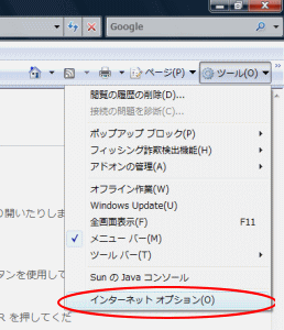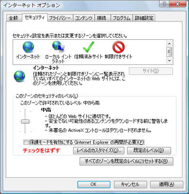 | Windows VistaのInternet Explorer初期設定では「コンビニ」内の情報が表示できないことがあります。その場合インターネットオプションの変更が必要となります。 1.Internet Explorerの「ツール」から「インターネットオプション」を開きます。 ![]() 2.「保護モードを有効にする」のチェックをはずし「OK」を押します。 ![]() |